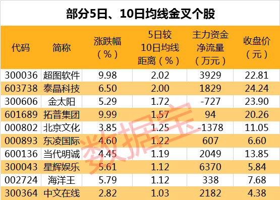 截至最新收盘,有81只A股的5日均线主动上穿10日均线,其中等个股的5日均线较10日均线距离最大,分别达2.02%、2%、1.72%。