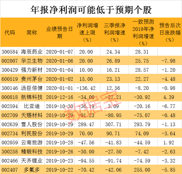 证券时报·数据宝统计,除去科创板个股和近期上市的次新股,在两市已发布年报业绩预告的五百余家上市公司中,14股预告净利润增速上限不但低于三季报净利润增速,且低于分析师一致预测年度净利润增速,全年业绩低于预期的概率较大。