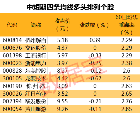 截至最新,592只个股5日、10日、20日、60日四条均线近日呈多头排列。其中股价与60日均线的乖离率最小,分别为2.29%、2.29%、2.29%。