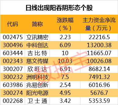 最新数据显示,两市共有74只个股日K线出现阳吞阴形态,当天涨幅最大的是,涨幅分别为10.04%、10.04%、10.03%。