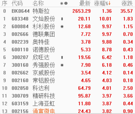 特斯拉概念活跃,文灿股份(行情603348,诊股)、杉杉股份(行情600884,诊股)、奥特佳(行情002239,诊股)涨停;