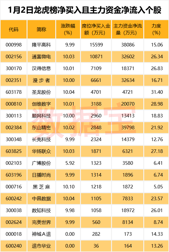 1月2日龙虎榜中机构及营业部席位资金净卖出2.62亿元,其中净买入的个股有19只;净卖出的个股有11只。