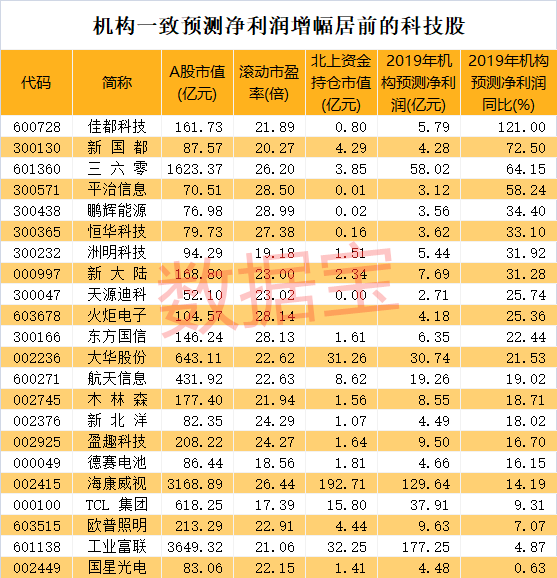 当前A股公司已进入年报披露期,哪些科技股业绩方面值得期待?根据5家以上机构一致预测数据,上述市盈率不足30倍的科技股中,12只科技股2019年净利润有望同比增长20%以上。机构一致预测净利润增幅最高的是佳都科技,净利润预测均值为5.79亿元,同比增长1.21倍。