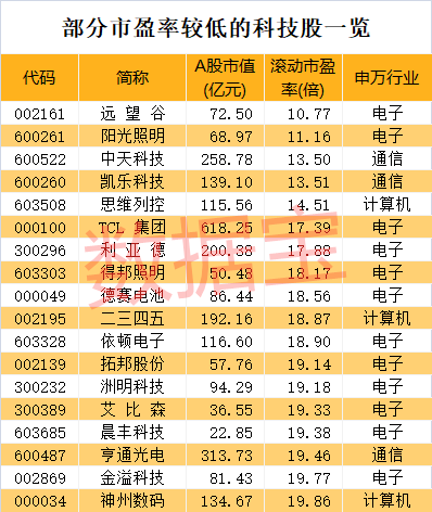 其次是阳光照明、中天科技、凯乐科技等。在上述市盈率不到30倍的科技股中,千亿级的科技龙头股工业富联、海康威视、三六零均在列,此外,安防监控行业龙头之一大华股份,半导体显示龙头TCL集团、光纤光缆龙头亨通光电、CDN行业龙头网宿科技、小间距LED龙头利亚德等。