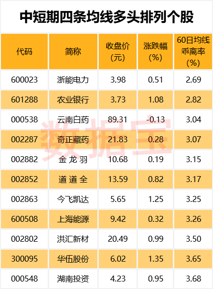 其中浙能电力、农业银行、云南白药股价与60日均线的乖离率最小,分别为2.69%、2.82%、3.04%。
