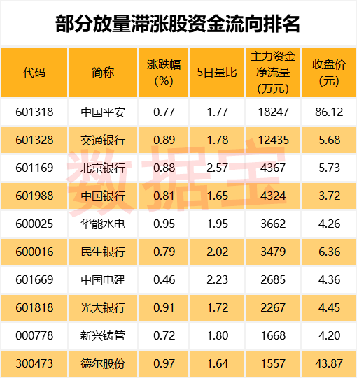 值得注意的是,304只放量滞涨股中,中国平安、交通银行、北京银行、中国银行、华能水电等个股主力资金净流入较多。