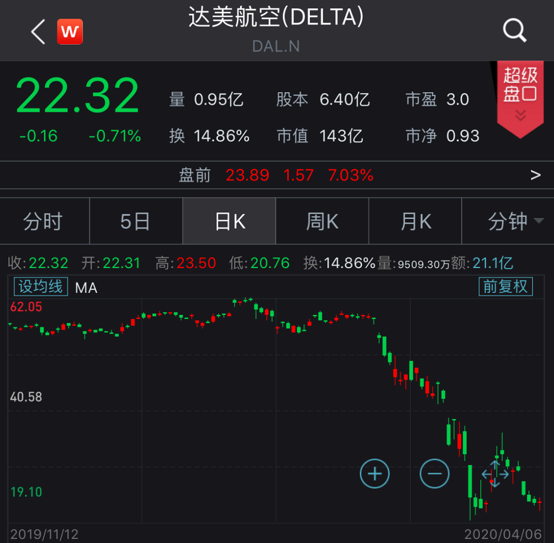 然而,巴菲特加仓之后,达美航空的股价仍一路下跌,最低一度跌至19美元/股,较巴菲特加仓价格跌去58.7%。