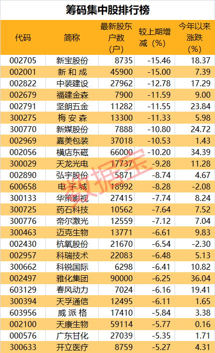 其次是新和成,最新股东户数为45900户,较去年末下降15%,新年以来该股累计上涨7.39%,累计换手率为10.79%。股东户数降幅居前的还有中装建设、福建金森、坚朗五金等。